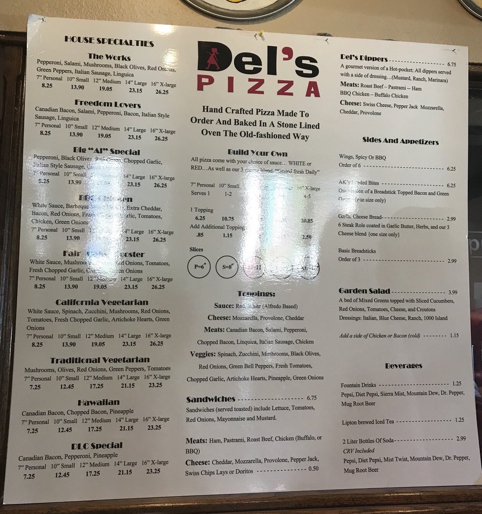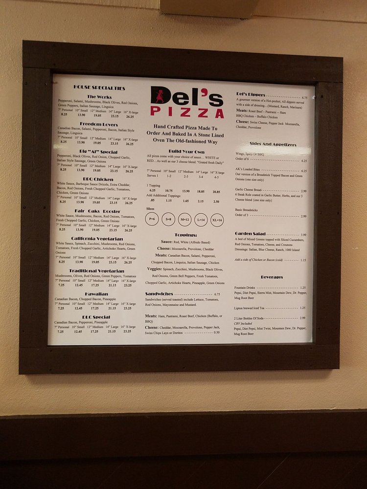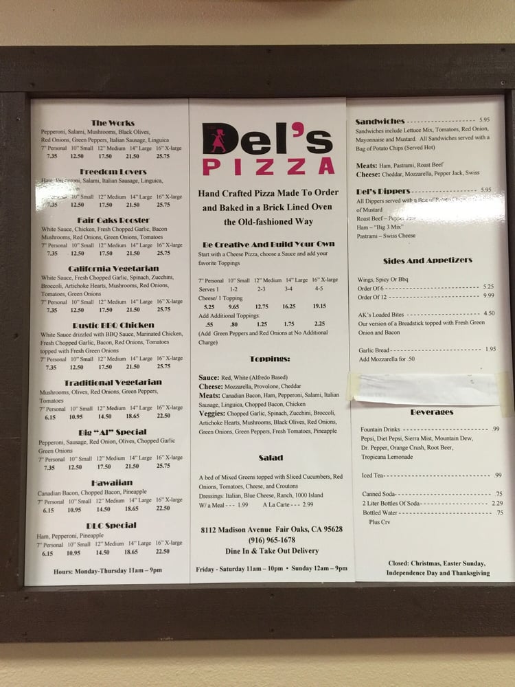Del's Pizza in Fair Oaks, CA provides a wide range of options for pizza lovers. From their Specialty Pizzas like Bbq Chicken and California Vegetarian to their Standard Pizzas like Hawaiian, there is something for everyone. The restaurant offers takeout, delivery, and even vegan and vegetarian options. With wheelchair accessibility, outdoor seating, and private dining available, Del's Pizza caters to a diverse set of customers. The reviews from loyal patrons praise the quality of the food and the friendly staff, making it a must-visit spot. Don't miss out on the chance to support this local, women-owned, and veteran-owned business while indulging in delicious pizza and excellent service. Experience the great flavors and welcoming atmosphere of Del's Pizza for yourself.